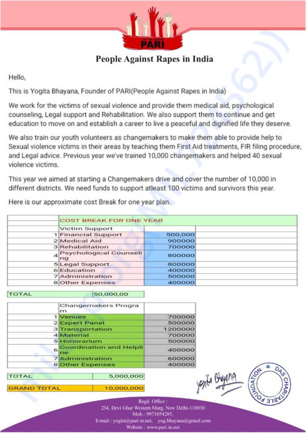 “Over the past decade, Yogita through PARI has extended a helping hand to more than 100 victims of sexual violence, providing invaluable support in legal battles, therapy, and education. In just the last 2-3 years only we have assisted 35 victims. It is a challenging task, but someone has to do it. Someone has to speak up for these rape survivors and make sure they find their way back to a normal life.” – Yogita